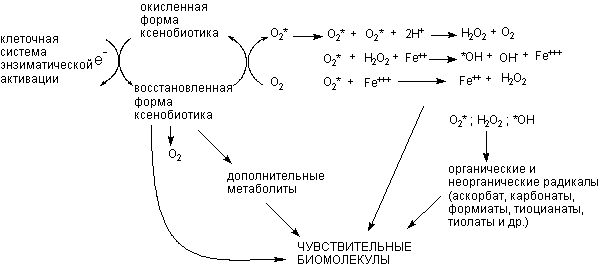 Для развития патологического процесса важно, чтобы окислительно-восстановительный цикл превращения ксенобиотика "работал" достаточно долго, с тем, чтобы произошло истощение механизмов антирадикальной защиты клетки (см. выше). Поскольку непродолжительная инициация окислительно-восстановительного цикла трансформации ксенобиотика может стимулировать систему антиокисдантной защиты, при интоксикациях некоторыми прооксидантами возможно развитие парадоксальной реакции, а именно - угнетение процесса окисления липидов в тканях.